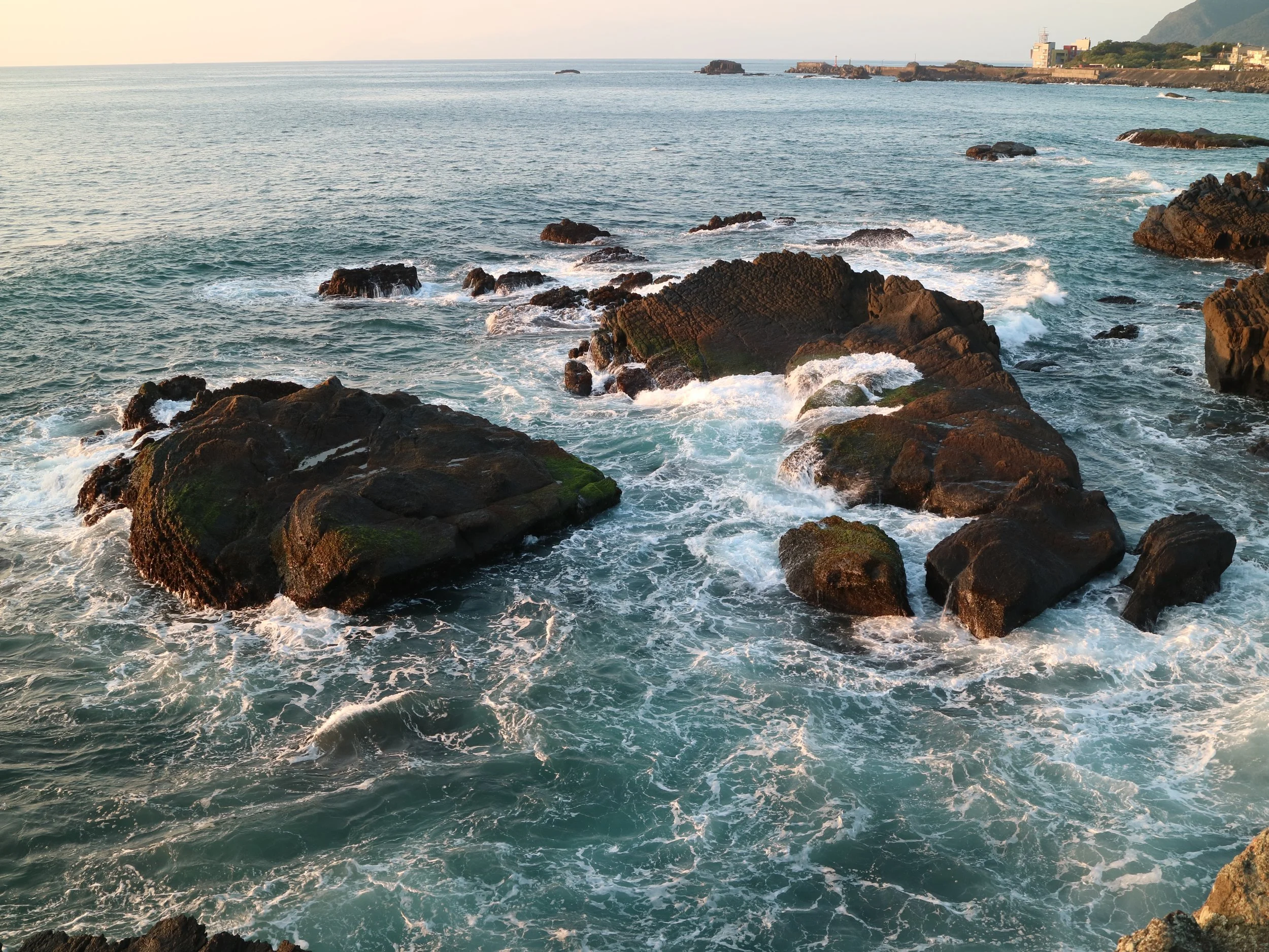 我的家鄉宜蘭頭城大里海邊的礁石群是台灣東北海岸線最迷人的風景之一。這些岩石歷經千萬年的風蝕與海浪的沖刷,形成了獨特的肌理和堅硬的姿態。我喜歡在這裡靜靜地等待海水的變化。這張作品中,主角是洶湧的浪花,它們撞擊在堅硬的礁石之間,激起了雪白的泡沫,彷彿是一場永無止盡的浪舞。光線在浪花中折射出萬千光芒。我在畫布上運用了厚重的顏料和層次的堆疊,力求描繪出岩石粗糙的質感和海水的透明感,捕捉大自然中這份堅韌與柔情並存的對話。