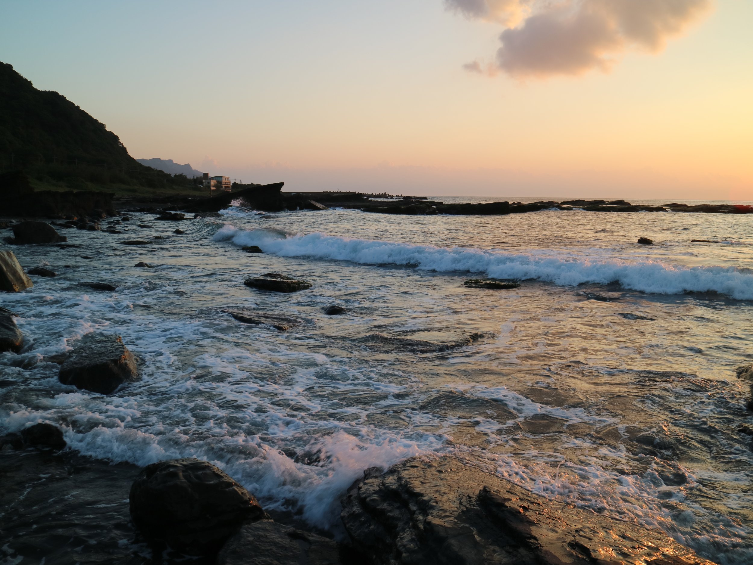 清晨的大里常有濃霧,整片海洋像是消失了一般。直到曙光漸露,霧氣才開始染上金芒。這幅小畫記錄了那種「從無到有」的視覺震撼。我用柔焦的處理方式表現霧氣的質感,傳遞出一種被治癒的、寧靜的心靈狀態。