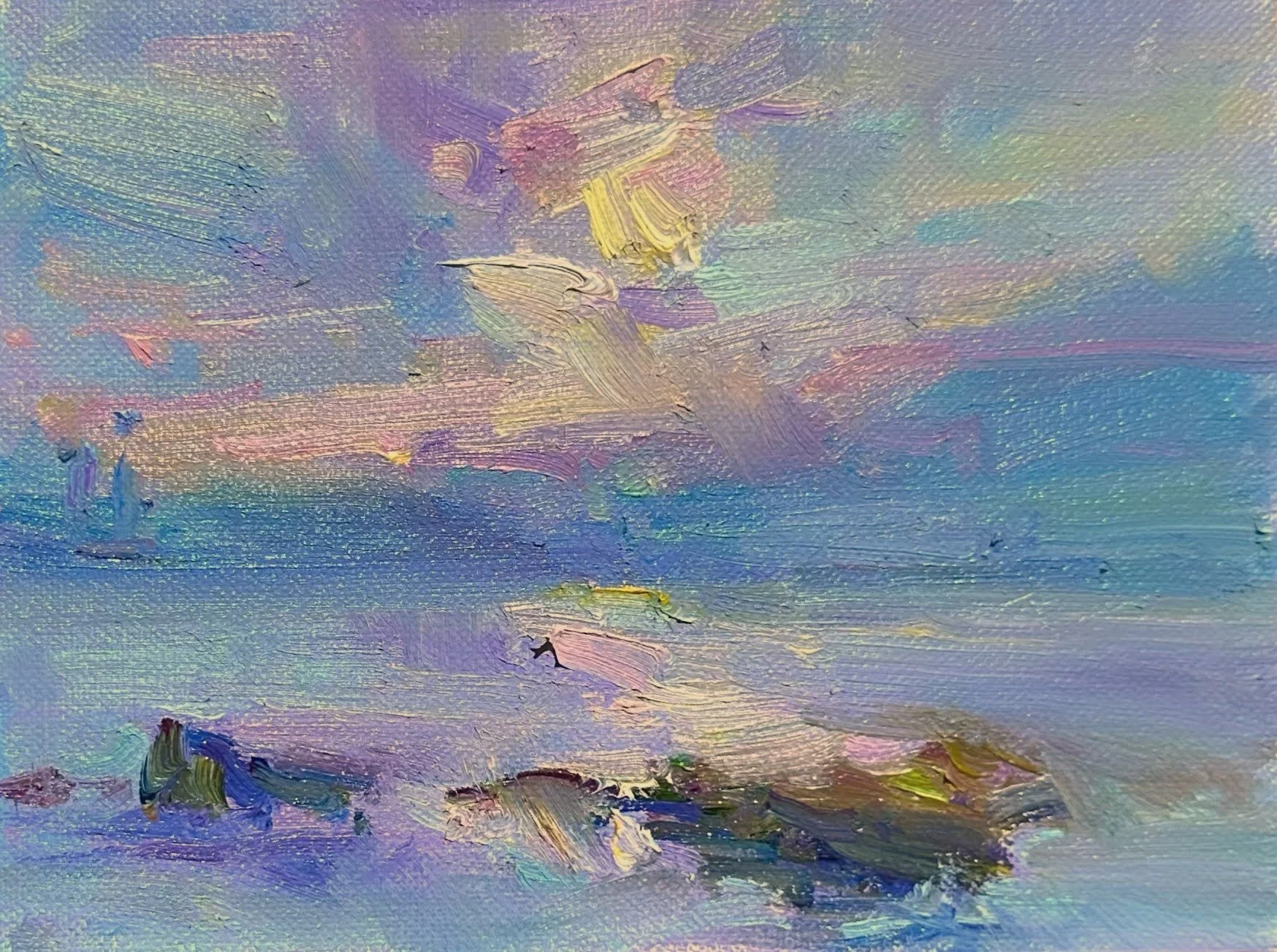 這幅畫捕捉了海面起霧時,光線在水氣中折射出的魔幻時刻。天空與海洋在淡紫與粉藍的調色盤中融為一體,彷彿夢境的邊緣。我試圖抹去具象的線條,只留下光影的暈染,讓觀者彷彿置身於一場溫柔的夢境中,感受那份被海洋輕輕擁抱的寧靜與柔軟。